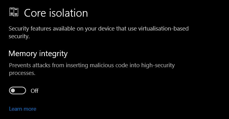 Ensure that Core Isolation is disabled.